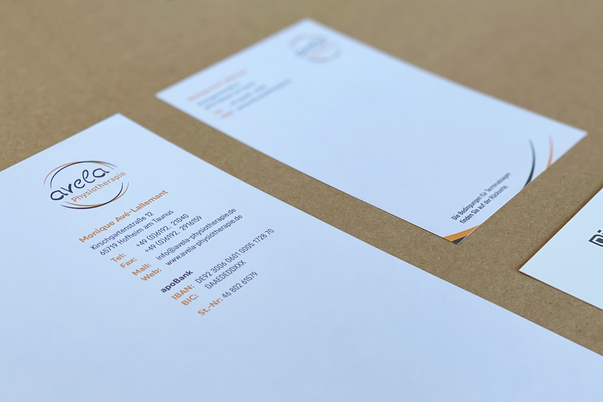Die grafischen Elemente des Logos treten immer wieder an den horizontalen Rändern der Medien auf und betonen die Dynamik und Aktivität als Ergebnis der Behandlung durch avela Physiotherapie.